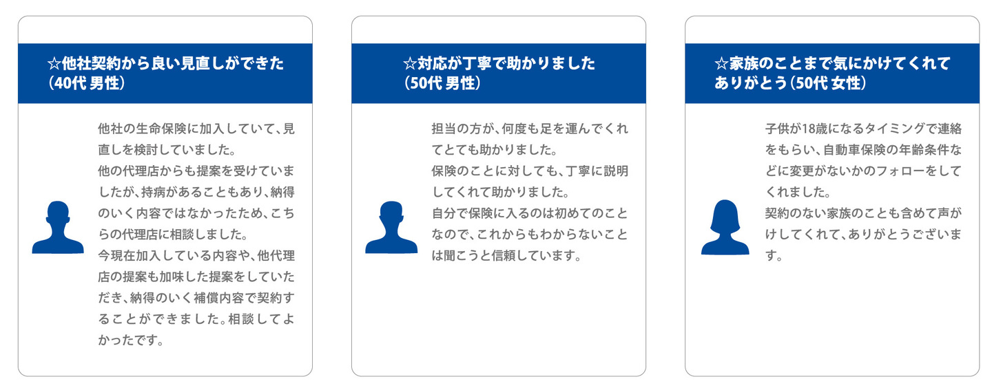 業務内容:■損害保険代理業務(自動車保険・火災保険・傷害保険・賠償責任保険他)■自賠責保険業務■生命保険募集業務(収入保障保険・医療保険・がん保険・認知症保険他)■各種団体保険取扱い